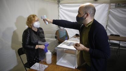 Los perjudicados por este rebrote optan por la discreción. Uno de ellos, según explica su pareja a través del telefonillo del portal, prefiere no contestar. Misma respuesta entre los contagiados del entorno de una de las jóvenes que ayudan en el frontón, aunque esta admite que “todo el pueblo los conoce”. Javier García le pone una sonrisa a la situación, más por resignación que por disfrute. La casualidad ha querido que le haya tocado presidir una mesa en dos elecciones consecutivas. Admite sentirse “cómodo y seguro” gracias a la mampara, la mascarilla y la distancia de seguridad.