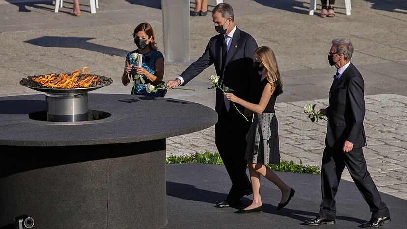 Las autoridades, acompañadas por el familiar de una víctima o el representante de un colectivo, han depositado una rosa blanca en el pebetero instalado en el centro del patio. El Rey lo ha hecho con Aroa López y la princesa Leonor que, tras su discurso, le ha advertido de que se volviera a poner la mascarilla.