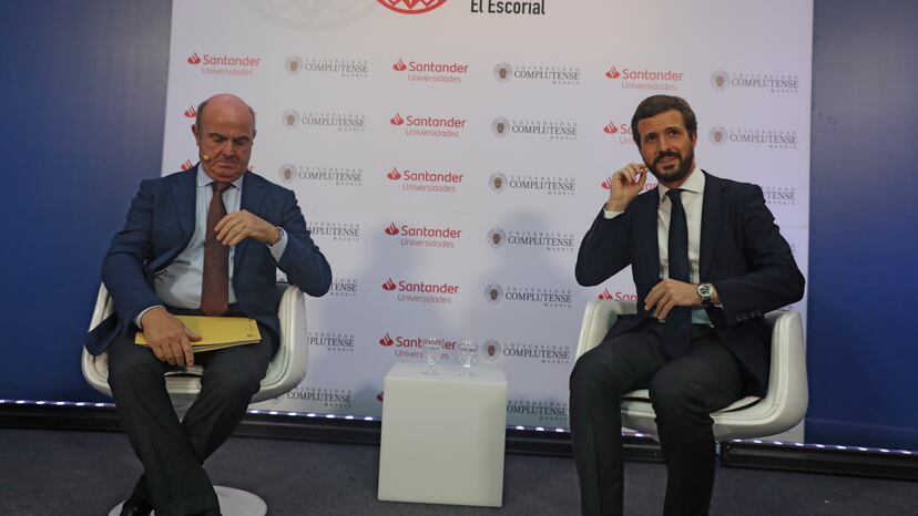 El ponente estrella de las jornadas, el exministro Luis de Guindos, ahora vicepresidente del BCE, no se metió en arenales políticos nacionales ni en su conferencia ni al responder a las preguntas que le plantearon alumnos o diputados y eurodiputados del PP. Lo que hizo fue una detallada y dura descripción de las incertidumbres y el choque sin precedentes que acecharán a España y la zona euro en el inmediato futuro tras la pandemia. Fue ahí cuando enumeró las proyecciones calculadas por ese organismo sobre una caída del 9% del PIB para la zona euro, otra del 20% para el comercio internacional y las exportaciones y una más preocupante del empleo que prefirió tasar sobre el descenso de entre el 10 y el 15% de las horas trabajadas mejor que sobre el paro directo ante la protección actual que están ofreciendo los ERTE.