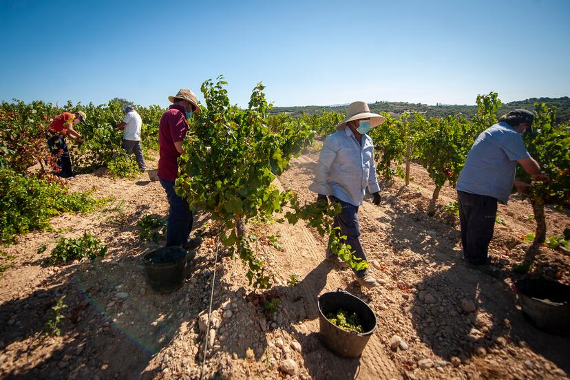 La cuadrilla de Juan Antonio García trabaja entre las parras de uva con la coordinación de una centuria romana. Avanzan a una velocidad que solo da la experiencia. García, natural de Jaén, lleva 37 años desplazándose al Penedès (Barcelona) para la vendimia. Se quita y se pone la mascarilla porque el calor, 32 grados, es un suplicio. Que el Gobierno les busque una alternativa, dice, porque esto no es compatible con las tareas agrícolas. La vendimia ha empezado en varias regiones de España con el objetivo de evitar los brotes de la covid-19 que se produjeron durante la pasada cosecha de la fruta de hueso en Aragón y Cataluña. Comisiones Obreras advierte que es en el transporte de los temporeros y en su alojamiento donde están identificando un mayor riesgo.