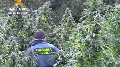 El tamaño de las plantas de marihuana ha sorprendido a Pablo Palacín, portavoz de la comandancia de Burgos, que acudió al terreno en cuestión, de unos 350 metros cuadrados: “Yo nunca había visto algo así, como mucho de dos metros o 2,40 metros”. Este guardia civil agradece a los habitantes de la zona que avisaran a una pareja de uniformados que estaba de servicio y les comentaran sus sospechas. Así comenzó una investigación que les llevó a una pista agraria por la que podían circular vehículos hasta que no se puede continuar. “Había que bajar a pie por un terraplén de unos cuatro metros, deslizándose”, explica Palacín. Después alcanzaron una finca de cereal y a continuación a un “bosque totalmente cerrado”. La comitiva dio con una pequeña senda marcada por el paso humano entre “piedras, helechos y chopos” antes de llegar a vadear un arroyo y subir a una zona donde, bajo un penetrante olor característico de este estupefaciente, localizaron “unas plantas enormes” totalmente enraizadas y bien atendidas.
