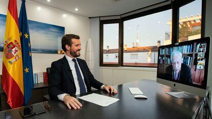 El líder del PP, Pablo Casado, ha comparado su labor de oposición en España con la de los opositores en Cuba y Venezuela en defensa de la libertad, que ve amenazada por el Gobierno de Pedro Sánchez. En un discurso este martes ante el XIII Foro Atlántico Iberoamérica y el mundo, sobre los desafíos tras la pandemia, en el que ha participado por videoconferencia, Casado ha alertado contra el avance del Ejecutivo “en el que parece ser su único objetivo: debilitar tanto a las instituciones que solo quede como referencia el poder de un presidente que, además, es el que menor apoyo popular ha tenido de toda la historia democrática de España”.