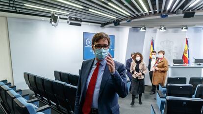 Salvador Illa deja el Ministerio de Sanidad en el peor momento de la tercera ola, con los contagios disparados en varias comunidades, para participar como candidato del PSC a la Generalitat en la campaña electoral a las elecciones autonómicas del 14 de febrero. Esta decisión, que ha generado una intensa polémica con la oposición e incluso dentro del Gobierno, porque ha sido criticada por Unidas Podemos, ha monopolizado la última rueda de prensa de Illa como ministro, en la que ha estado arropado por la portavoz, María Jesús Montero, y el ministro de Seguridad Social, José Luis Escrivá. La Moncloa había diseñado una despedida de Illa para mostrar el respaldo del Ejecutivo a su candidato en un momento de intensas críticas. Montero ha dejado muy claro que estas tensiones con Unidas Podemos previas a la campaña no ponen en riesgo ni la coalición ni la estabilidad del Gobierno, mientras Illa ha justificado su decisión de preferir la candidatura al ministerio en este momento.