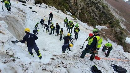 El operativo de búsqueda del quitanieves desaparecido en San Isidro (Asturias) el pasado 1 de enero ha localizado al fin el cadáver de Virgilio García, de 62 años. El cuerpo llevaba desde el día del accidente, en el que también falleció su compañero César Fernández, sepultado por la inmensa masa de nieve que cayó desde una pendiente pronunciada sobre la carretera que ambos operarios estaban despejando. El operativo de búsqueda, en el que participan bomberos y agentes de montaña de la Guardia Civil, procederá a liberar el cuerpo de la nieve con una grúa. Uno de los responsables de los bomberos avisó a las 11.23 que habían dado con el cadáver, durante los paleos en la nieve, gracias a que se habían despejado previamente unos cinco metros de manto blanco, si bien había todavía otros cinco por retirar.