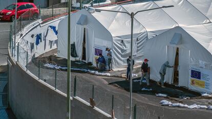 El acuartelamiento Canarias 50, uno de los dos habilitados para la acogida de inmigrantes en Las Palmas de Gran Canaria, se ha inundado este lunes por la mañana de aguas fecales. Las heces cubrieron la explanada donde se han instalado las carpas y llegaron a mojar el interior de las tiendas, según puede verse en los vídeos enviados a EL PAÍS por los residentes. Un problema en el alcantarillado, ajeno al centro, está impidiendo que las aguas negras y las de lluvia se canalicen correctamente y el campamento, donde viven unos 400 marroquíes, ya ha sufrido dos inundaciones desde el viernes. La avería está en vías de solución con el Ayuntamiento, según una portavoz de la Secretaría de Estado de Migraciones.