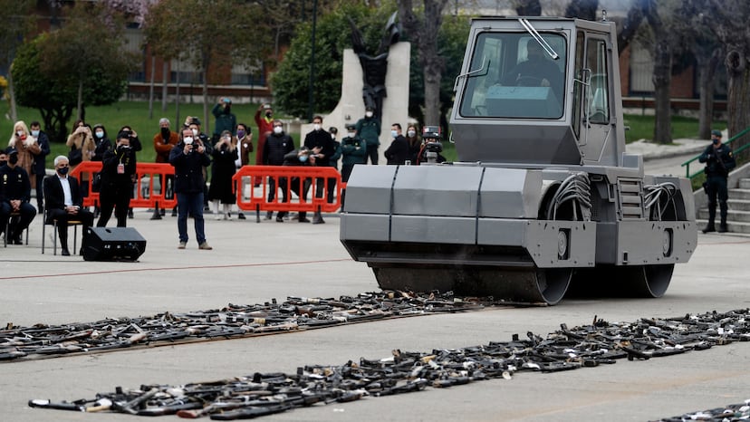 Un integrante de cada uno de ellos participó en la retirada de la tela que cubría las 1.377 armas de fuego completas y 19 piezas fundamentales que se habían dispuesto en el suelo antes de que una apisonadora escenificara su destrucción pasando por encima de parte de ellas (todas serían trasladadas más tarde a un horno de fundición para su eliminación total, como fijan los protocolos). Eran armas intervenidas a ETA y a los GRAPO en operaciones desarrolladas en España; las causas judiciales por los atentados en las que se usaron habían sido instruidas en la Audiencia Nacional entre 1977 y 2005, y ya estaban juzgadas.