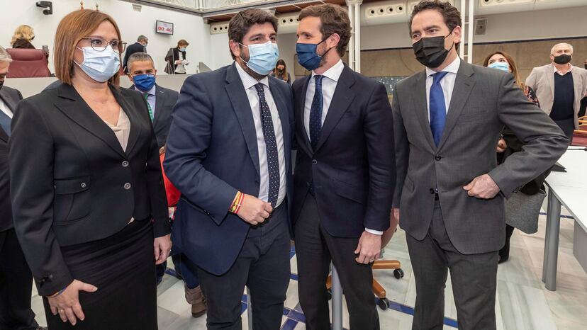 Las filas de la derecha estallaron de júbilo nada más consumarse el fracaso de la moción de censura impulsada por PSOE y Ciudadanos. El salón de plenos de la Asamblea regional se convirtió de repente en una fiesta —sin distancia social, por supuesto— y al jolgorio se sumó Casado, siempre con la escolta de su secretario general, Teodoro García Egea, el murciano al que sus rivales atribuyen la paternidad de la maniobra. “Hoy gana la libertad”, se felicitaba el presidente regional, Fernando López Miras. “Comienza un maravilloso periodo de esperanza”, se unían al alborozo los tres diputados expulsados de Vox, a quienes Casado y García Egea acudieron raudos para agradecerles su apoyo. Una nueva etapa en la que los purgados por Santiago Abascal aspiran a hacerse con la Consejería de Educación e implantar de inmediato el veto parental en las escuelas.