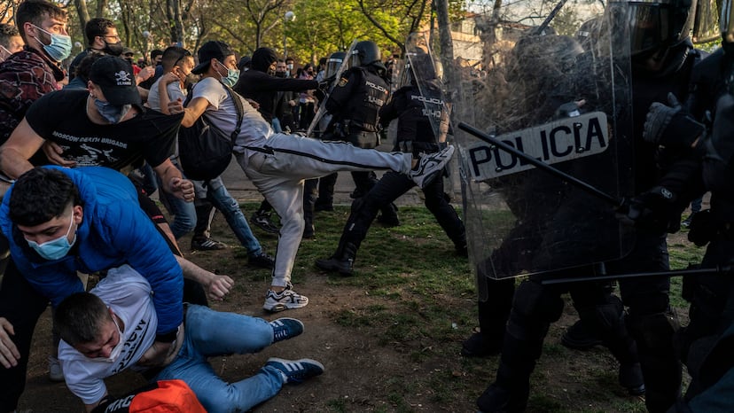 En el centro de la plaza, arremolinados en torno a la improvisada tribuna, los seguidores de Vox, con banderas españolas y carteles verdes, el color del partido ultra, con el lema “barrios seguros”. Rodeándoles, con pancartas en las que se le leía “fuera fascistas de nuestro barrio” o “Madrid será la tumba del fascismo”, manifestantes convocados por grupos de extrema izquierda. Entre ambos, un cordón de policías antidisturbios, con casco, escudos y porras, separando a los dos grupos.
