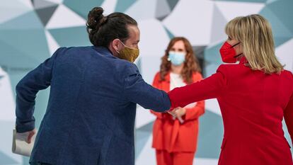 La segunda hora se animó. Ya habían calentado, y veían que pasaba el tiempo y aún no habían echado la parrafada buena, la que habían ensayado. Gabilondo tuvo su mejor momento con lo que tenía más claro, los mantenidos de Ayuso, esa amable expresión de la presidenta para referirse a las colas del hambre. Se veía que al profesor le salía del alma, porque tenía un fondo filosófico, trascendental, de la condición humana, y se pudo explayar. Monasterio vino a bajar el nivel con su cartel que compara el supuesto dinero que se llevan jubilados y menas, que además violan mujeres en los parques, y eso si los okupas no se te meten en casa. Colocó siempre bien su mensaje tan clarito a su público. Ahí se unieron contra ella Gabilondo, Iglesias y también se metió Bal, que al final fue de los que más le sacudió, para recordarle lo que es el Estado de bienestar: “Tienen ustedes que aprenderlo porque son un poco antiguos”. Luego apuntó a Ayuso, y fue cosa de ver cómo los dos exsocios se echaban reproches a la cara. Cuando Gabilondo dijo que si gana no va a subir los impuestos, también se activó ese frente. Iglesias saltó casi con miedo: “Vamos a ver Ángel, desde el compañerismo…”. Y el otro que no y que no, y el exvicepresidente cabeceaba contrariado.