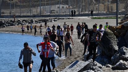 Al menos 5.000 inmigrantes sin documentación han conseguido entrar ilegalmente en Ceuta a lo largo del lunes, según ha informado a última hora del día la Delegación del Gobierno en Ceuta. Fuentes gubernativas han señalado a Efe que el recuento en marcha indica que unos 1.500 de ellos pueden ser menores de edad, a la espera de que se practiquen las pruebas pertinentes para determinar este alcance. La mayor cantidad de entradas se ha registrado entre las 16.30 y las 19.00. Los migrantes han llegado a nado o empleando medios rudimentarios desde la ciudad vecina de Fnideq, de 77.000 habitantes, antigua Castillejos, bordeando un espigón que marca la frontera entre ambos países. Uno de los migrantes ha muerto, según ha adelantado la Cadena SER y ha confirmado este diario, y unos 300 ya habían sido devueltos a Marruecos antes de las diez de la noche, apuntan fuentes policiales. La llegada se produjo sin que las autoridades marroquíes opusieran ninguna resistencia y tras varias semanas en que Marruecos ha decidido tensar la cuerda diplomática con Madrid. El Gobierno marroquí guardó silencio durante toda la jornada.