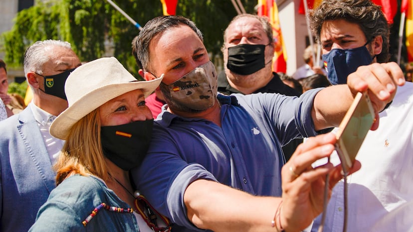 Se amontona gente fuera, pero la organización es clara: no se va a permitir más aforo del aconsejado por las restricciones de la pandemia. Es un intento loable por parte de los voluntarios de la asociación Unión 78 (por supuesto la gente se agolpa, especialmente en los alrededores del escenario, pero en los laterales hay espacio para respirar y más distancia que la del metro y medio de separación exigido), que también son escrupulosos con la neutralidad política sobre los líderes (“¿Sabe a qué hora llega Abascal?”, pregunta el periodista. “No sabemos ni estamos para saberlo; vendrá, si viene, a la hora que le parezca”). Un estruendo de aplausos interrumpe la conversación. ¿Es Abascal, por fin? ¿Es Rosa Díez, en su enésimo renacimiento político como organizadora del acto? No, es un votante del PSOE. Un votante socialista al que cientos de personas aplauden a su paso y le gritan “viva España” y “olé tus huevos”, porque obviamente es un votante del PSOE arrepentido, o eso dice él, con una pancarta que cuenta: “Yo, votante del PSOE, al pueblo pido perdón y al Gobierno, dimisión”.