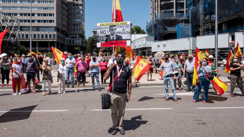 En medio de toda la bulla, Socorro, de 61 años, sostenía una pancarta: “No indultos a chorizos”. Decía haber venido desde Cataluña y, rodeada de una bandera rojigualda con un corazón, se unió a los gritos. “Todo lo que dicen es lo contrario de lo que han hecho. Todos son mentiras, son unos incompetentes, no saben gestionar nada”. Socorro cuenta que vivió en Barcelona los hechos del 1 de octubre, con la celebración del referéndum ilegal de autodeterminación. “Los mismos políticos golpistas están en el Gobierno”. Como ella, decenas de ciudadanos más coinciden en que esta protesta no se limita al problema de los presos catalanes que ha acaparado el foco estas semanas. Aluden otras cuestiones: la gestión del coronavirus, la reforma educativa, la Ley de Memoria Democrática, la reforma del Código Penal o la crisis económica.