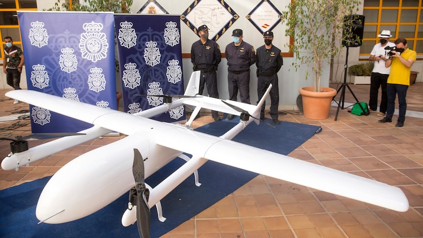 De un blanco impoluto, cuatro metros y medio de envergadura y capacidad para transportar hasta 150 kilos de carga, un enorme dron relucía este martes en el patio de la Comisaría Provincial de Málaga. Es la última y sorprendente incautación de la Policía Nacional a una organización de narcotraficantes franceses que buscaba asentarse en la Costa del Sol. Los delincuentes lo utilizaban para transportar droga desde Marruecos hasta una pequeña localidad malagueña, Almáchar (1.811 habitantes). Con una autonomía de siete horas y una velocidad máxima de 170 kilómetros, su radio de acción para trasladar sustancias estupefacientes “es enorme”, según Antonio Rodríguez Puertas, inspector jefe responsable de la Unidad de Delincuencia y Crimen Organizado (Udyco) en Málaga. “Jamás habíamos visto un dron de este tamaño para esta utilidad. Había algún precedente, pero nunca como este. Es el más grande intervenido en España”, ha destacado Pedro Luis Bardón, jefe de Medios Aéreos de la Policía Nacional.