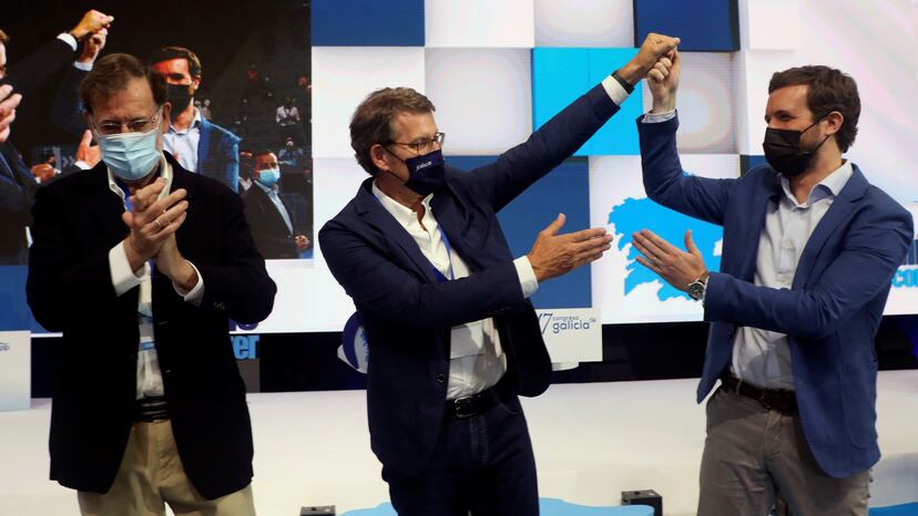 “En Galicia [con Feijóo] los ciudadanos pueden estar tranquilos, pero no ocurre igual a 600 kilómetros”, ha dicho Rajoy, refiriéndose al Gobierno central. “Porque esos, en lugar de poner a la gente tranquila, la ponen de los nervios; y lo único que puede ayudarnos en una circunstancia como esa es que sabemos que hay una alternativa sensata para el futuro con el PP y Pablo Casado, al que todos vamos a ayudar, cada uno en lo que pueda”, ha comprometido. “Aunque se haya ido Pablo Iglesias, sigue habiendo demasiados líos. Dentro y fuera, con el Supremo, con el Constitucional”, ha continuado el expresidente del Gobierno: “Así es muy difícil”, ha dicho, “ocuparse de la gente”.