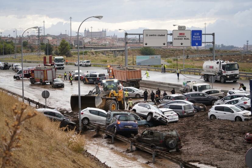 Cerca de Toledo, en Guadamur, una riada ha anegado sus calles. Coches arrastrados, destrozos en las carreteras e inundaciones de casi un metro de altura es la imagen que ofrece el pueblo, que ha resultado de los más afectados por el temporal. La plaza central ha quedado inaccesible. El temporal ha destrozado grandes fragmentos de asfalto y ha llenado las carreteras de lodo, restos de árboles y piedra arrancada de las paredes de las casas. Los vehículos han quedado bloqueados por el fango arrastrado por las riadas, que han derribado el monolito construido en mitad de la plaza. Los parques han quedado inundados por completo.