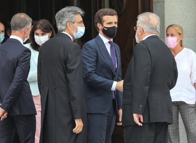 Entre los asistentes estaba también el presidente del PP, Pablo Casado, que en los casi tres años que lleva caducado el actual Poder Judicial ha bloqueado las posibilidades de pacto para la renovación al tratar de imponer condiciones cambiantes y difícilmente asumibles por parte del Gobierno. El líder del PP ha asistido imperturbable al acto de apertura del año judicial y se ha encontrado a su favor con que Lesmes, aunque ha apelado directamente a las fuerzas políticas a desbloquear el órgano, no ha hecho mención expresa a la actuación del principal partido de la oposición. En cambio, sí criticó con dureza la reforma legal exprés promovida por el Gobierno que impide al CGPJ seguir hacer nombramientos discrecionales cuando, como ahora, esté en funciones.