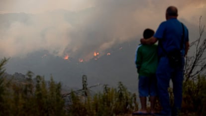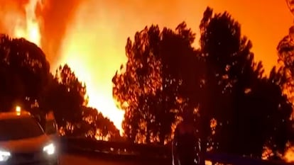 A las 3.30 de este jueves, la policía aporreaba la puerta del apartamento de Víctor y Lorena. La joven, de 25 años, empezó a llamar al 112 en torno a las 23.00 del miércoles, cuando el fuego empezó a comer terreno al monte frente a su ventana. “Todos decían que estaba controlado o que estaba muy lejos y que no iba a llegar”, explica Víctor, de 34 años, “y de pronto nos teníamos que ir, que no era inminente que fuéramos a quemarnos, pero que había que irse; nos daban unos minutos para coger lo que era importante”.
