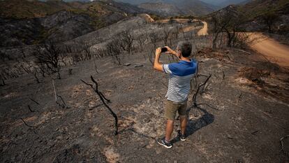 Sobre las 16.30 de este viernes casi una decena de aviones cruzaba sin descanso el cielo sobre la vaguada que conforma el río Padrón, que desemboca en el municipio costero de Estepona, el más afectado por el incendio. Al final de la ladera que corre paralela a un cauce cuajado de fincas aguardaba la tierra yerma y aún caliente ante un horizonte de picos coronados por dos enormes pirocúmulos. Toda la región es una sucesión constante de cañadas, cumbres y pendientes donde apenas se encuentra un llano. El fuego es capaz de entrar por los recovecos de la sierra y jugar con el viento para crear una dinámica propia que puede hacer cambiar un frente en cuestión de minutos. En ese mismo punto, una moto se acercaba a comprobar el destrozo donde el jueves se detuvieron las llamas. “Mi novia tiene aquí una finca de fin de semana y me ha pedido que viniese a echar un vistazo”, comentaba el joven antes de dar la media vuelta y desaparecer por el camino a medio asfaltar. Varios coches jalonaban las casas frente a limoneros a medio calcinar y fumarolas aún activas en la tierra.