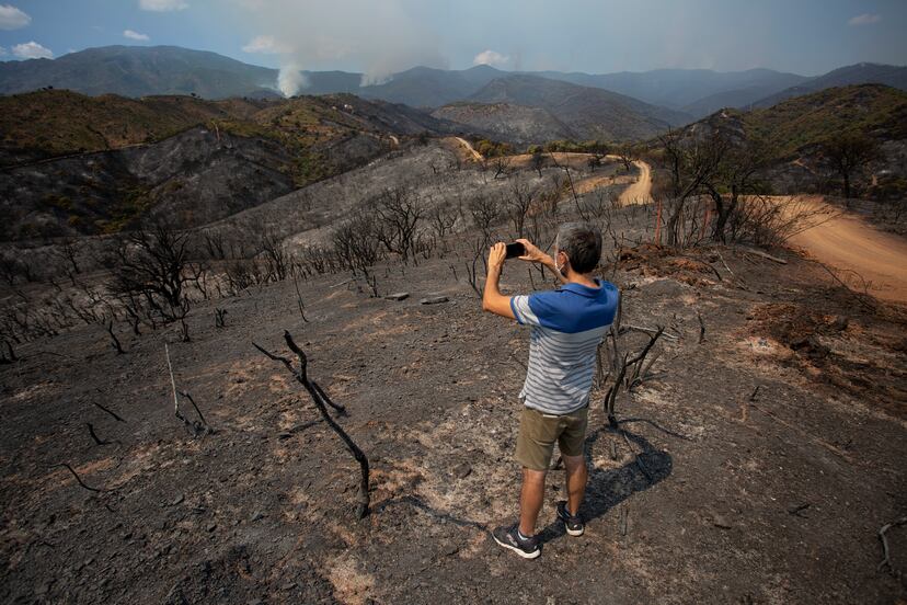 Sobre las 16.30 de este viernes casi una decena de aviones cruzaba sin descanso el cielo sobre la vaguada que conforma el río Padrón, que desemboca en el municipio costero de Estepona, el más afectado por el incendio. Al final de la ladera que corre paralela a un cauce cuajado de fincas aguardaba la tierra yerma y aún caliente ante un horizonte de picos coronados por dos enormes pirocúmulos. Toda la región es una sucesión constante de cañadas, cumbres y pendientes donde apenas se encuentra un llano. El fuego es capaz de entrar por los recovecos de la sierra y jugar con el viento para crear una dinámica propia que puede hacer cambiar un frente en cuestión de minutos. En ese mismo punto, una moto se acercaba a comprobar el destrozo donde el jueves se detuvieron las llamas. “Mi novia tiene aquí una finca de fin de semana y me ha pedido que viniese a echar un vistazo”, comentaba el joven antes de dar la media vuelta y desaparecer por el camino a medio asfaltar. Varios coches jalonaban las casas frente a limoneros a medio calcinar y fumarolas aún activas en la tierra.