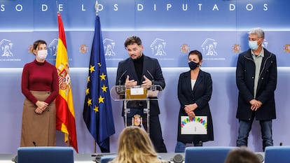 El portavoz parlamentario de ERC, Gabriel Rufián, en rueda de prensa conjunta, este martes.Vídeo: Alejandro Martínez Vélez / Europa Press
