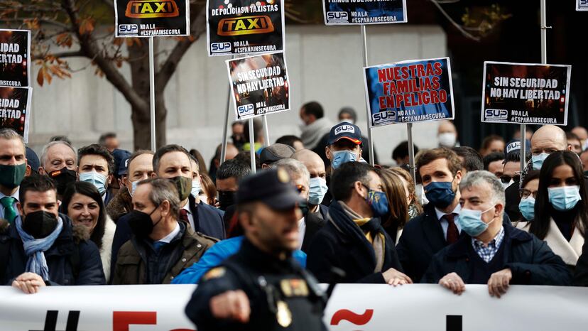 PP, Vox y Ciudadanos han vuelto a coincidir este miércoles en una protesta en la calle tras la concentración del 10 de febrero de 2019 en la plaza de Colón de Madrid que dio lugar a la icónica imagen de la derecha unida contra el Gobierno de Pedro Sánchez. Dirigentes de los tres partidos a la derecha del PSOE se unieron a la movilización convocada por sindicatos y asociaciones de policías contra la anunciada reforma de la Ley de Seguridad Ciudadana ―la conocida como ley mordaza― ante la Delegación del Gobierno en Madrid. Los presidentes del PP y Vox, Pablo Casado y Santiago Abascal, respectivamente, estuvieron cerca de la pancarta y a escasa distancia uno del otro. También asistió el portavoz adjunto de Cs en el Congreso, Edmundo Bal. Una imagen que se repetirá, previsiblemente, el próximo sábado, cuando otra plataformapolicial ha convocado una manifestación que recorrerá las calles del centro de Madrid.