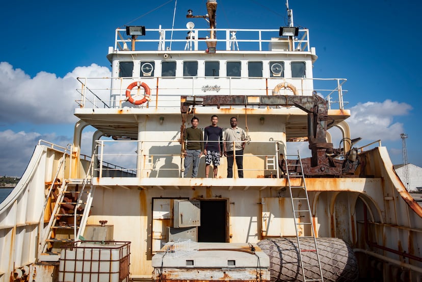 Los tres duermen en colchones sobre el suelo en el puente, en un contenedor instalado en la popa y en un cuarto junto a la sala de máquinas. Se afanan por mantener dignas las estancias, a pesar de que los productos de limpieza escasean, pero sobre todo conservan a punto los dos motores y los generadores de electricidad porque de su venta en una hipotética subasta podría depender el cobro de sus salarios. En la sala de máquinas el ruido aturde, huele a gasóleo y apenas hay ventilación. Sin embargo, los tripulantes mantienen su rutina como si una nueva travesía fuera inminente.