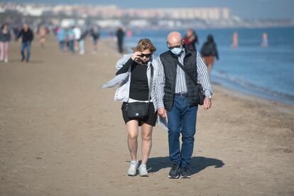 A tope. Las playas de Valencia y los restaurantes arroceros que se asoman a ellas están llenos en este primer día del año 2022. El reclamo del sol radiante nunca falla. Lo dice María Ángeles Miralles, directiva de la asociación de hosteleros del paseo marítimo y propietaria de La Alegría de la Huerta: “Hay muchísima gente. Hay turismo internacional y nacional. Cuando el tiempo es buenísimo como ahora, la gente sale seguro. No falla”. “En los días señalados como la Navidad ha habido cancelaciones por los contagios en las familias. Lo hemos notado en las reservas, claro. Pero el buen tiempo siempre compensa a pesar de las anulaciones, sobre todo para los que tenemos terrazas amplias”, añade.