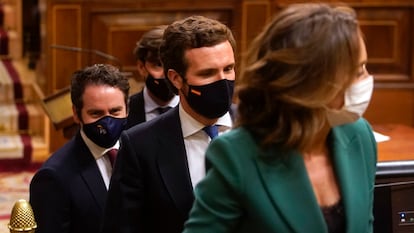 Su explicación de esa supuesta modificación de la voluntad popular en los despachos se refería, en realidad, a prácticas habituales y democráticas de las que también participa el PP. Casado ha puesto dos ejemplos: “Como han hecho en Navarra pactando con Bildu en contra de la lista más votada, y también en la moción de censura que han intentado en Castilla y León hace un año, que es el motivo de la inestabilidad que ha hecho adelantar las elecciones a Mañueco”. El primer caso es un pacto como el que el PP llevó a cabo precisamente en Castilla y León con Ciudadanos en 2019, cuando ganó el PSOE las elecciones y los populares le arrebataron la presidencia. El segundo caso se refiere a una moción de censura, un instrumento recogido en la Constitución.