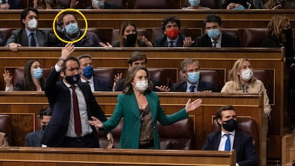 El PP protesta airadamente. La portavoz Gamarra intenta tomar la palabra. Quiere que se rectifique el voto alegando que, “con carácter previo a la votación, se ha puesto de manifiesto un error informático...”. Batet le niega el uso de la palabra y levanta la sesión, mientras se escuchan los primeros gritos de tongo. Casero, secretario ejecutivo de Organización Nacional del PP y actualmente investigado por un caso de corrupción en Trujillo (Cáceres), de donde fue alcalde, ha logrado entrar en el Hemiciclo, pese a que, en teoría, las puertas estaban cerradas. Se le puede ver en las fotos, mientras el PP protesta. Gamarra indicó que los servicios de la Cámara no le dejaron acceder antes al interior durante la votación por orden del vicepresidente segundo, Alfonso Gómez Rodríguez de Celis.