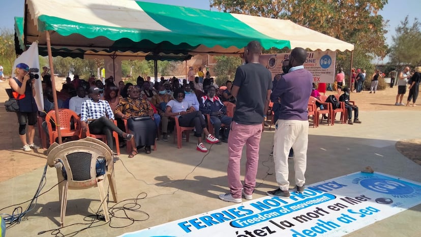 “Migrar para vivir, no para morir. Ni olvido, ni perdón; verdad, justicia y reparación. Hacemos una promesa, la de no olvidar a quienes han muerto y luchar contra las fronteras que los han matado”. Bajo este lema registrado en un cartel que dominaba el improvisado escenario, los miembros de colectivos de la sociedad civil senegalesa fueron desfilando para pedir vías legales y seguras para las migraciones hacia Europa y el fin de lo que llamaron políticas represivas y mortíferas. El actor Pape Sidi Sy, de la compañía Teatro Forum de Thiaroye, convirtió en arte escénico esta reivindicación. “Se llevan nuestros recursos, el oro, los diamantes, el pescado. Pero no quieren a los africanos”, remataba Sy.