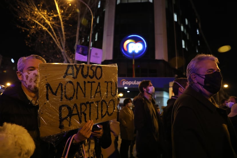 Un centenar de personas se ha agrupado la tarde de este jueves a la puertas de la sede del PP en la calle Génova de Madrid. La crisis desatada entre la cúpula nacional del Partido Popular y la presidenta madrileña, Isabel Díaz Ayuso, no ha pasado desapercibida para un grupo de seguidores de la líder regional. Son casi las ocho de la tarde y decenas de personas jalean a Ayuso como su “presidenta”, pero del Gobierno central. Entre los aglomerados hay personas de todas las edades. “Mejor me paso a Vox”, gritan los más jóvenes. “Ya aguantamos a un Rajoy, no vamos a aguantar a otro”, corean los más mayores. Ondean banderas de España, multitud de coches que pitan en apoyo a los concentrados y cinco furgones de la policía controlan que el tránsito peatonal no deje de funcionar. Cada dos minutos alguien vocea: “¡Fra-Casado dimisión!”, y todos se suman. Retumba el enfado porque el Partido Popular haya abierto un expediente a la presidenta por las acusaciones contra Casado de este jueves por la mañana.
