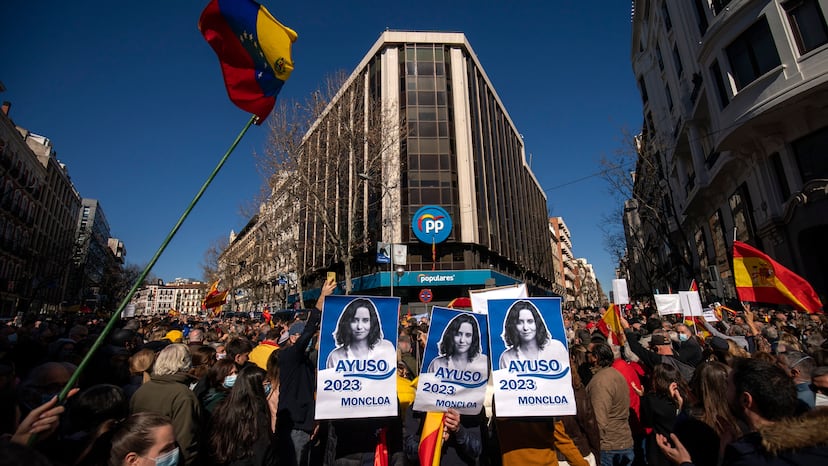 Allí no había dirigentes políticos conocidos, solo militantes y simpatizantes de a pie y de todas las edades. La manifestación había sido convocada a través de las redes sociales por los partidarios de Ayuso, que no hizo ningún pronunciamiento público, ni para alentarla expresamente ni para disuadir a su hinchada. Los llamamientos para concentrarse ante las sedes del PP en otras ciudades españolas apenas han tenido repercusión, al contrario que en Madrid, donde los gritos y las pancartas caseras, con retales de fotos y escritas a rotulador, ofrecían la estampa de una protesta espontánea. Otros grupos parecían más organizados, como los que enarbolaban carteles de imprenta con una imagen de Ayuso y el lema “Moncloa 2023″.