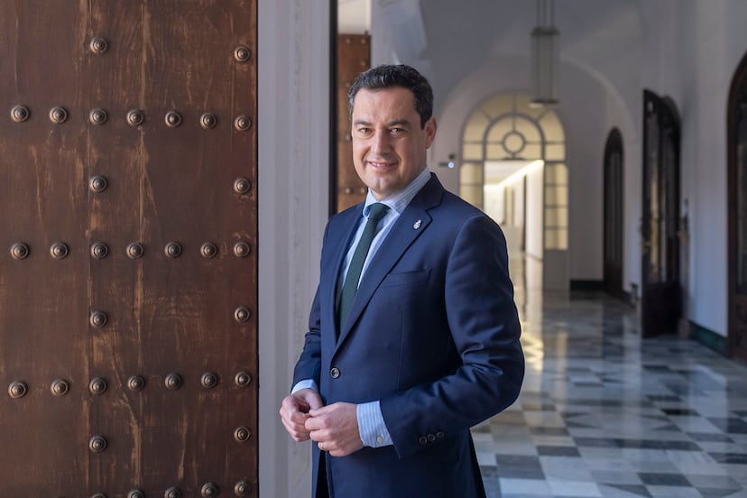 En el despacho de Juan Manuel Moreno Bonilla (Barcelona, 51 años) en el Palacio de San Telmo lucen fotografías suyas con Barack Obama, con Adolfo Suárez y con Pablo Casado, el recientemente defenestrado líder de su partido. El presidente de Andalucía ha tenido un papel clave en los momentos previos a la salida de Casado, y asegura que medió para conseguir que pudiera despedirse en el congreso de abril, porque unos cuantos querían cobrarse antes su cabeza. En contacto permanente con Alberto Núñez Feijóo, con quien ha auspiciado la nueva etapa del PP, Moreno anticipa cambios en la relación de los conservadores con el PSOE, al tiempo que abre la puerta de sus gobiernos a Vox si cambia de actitud. Por las ventanas de San Telmo se cuelan los pitidos de una protesta de agricultores que piden medidas contra la sequía.