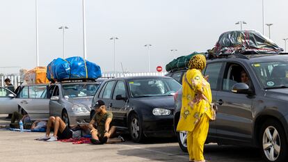 Fátima Gámez y Samal Lamaayzy arrancaron su todoterreno negro la tarde de este pasado miércoles y condujeron los 1.001 kilómetros que separan Vitoria de Algeciras con las paradas justas para descansar. 15 horas después, ya al filo del mediodía del jueves, esperaban tranquilos, pero agotados, en la zona de espera habilitada en estos días para embarcar en el ferri que les llevará a Tánger. “Cuando bajas, tienes la ilusión”, se justifica Lamaayzy. Él y su mujer tienen un abrazo pendiente en Rabat desde hace dos años. Como la suya, el puerto algecireño es un condensador de historias familiares a ambos lados del Estrecho que se quedaron congeladas por la pandemia y la crisis diplomática con Marruecos.