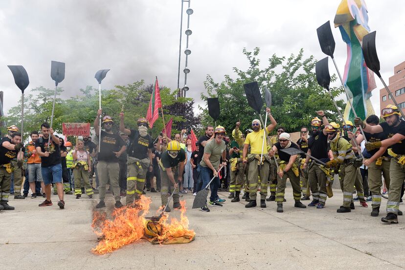 Las chaquetas ajadas, las botas y los batefuegos han sustituido este miércoles en las Cortes de Castilla y León a los trajes y maletines de los políticos. Más de un centenar de bomberos de la comunidad se ha concentrado frente al Parlamento, en Valladolid, para exigir la mejora de sus condiciones laborales y reclamar que la Junta (PP-Vox) disponga de más medios contra incendios. Los colectivos sostienen que las 30.000 hectáreas arrasadas en la sierra de la Culebra (Zamora) muestran una escasez de efectivos humanos y materiales crucial para impedir o amortiguar estas catástrofes, algo que niega la Junta.