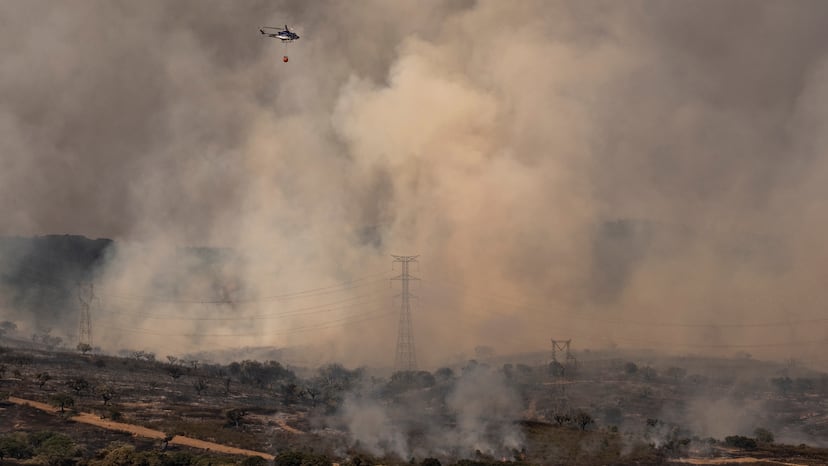 El terreno está totalmente calcinado. “La mayoría de los terrenos son para la caza. Hemos venido esta mañana a sacar las vacas de un compañero”, explica Julián Cobos, de 28 años, que se limpia el sudor de la cara con su camiseta y se resguarda de los rayos de sol bajo un sombrero de paja. A las seis de la tarde del viernes, el fuego empezó a coger fuerza y ya eran cuatro los helicópteros que sobrevolaban el cielo de calima.