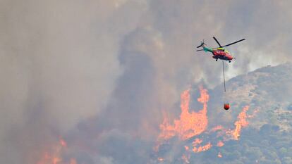 En Alhaurín el Grande cientos de vecinos se han echado a la calle para observar el trabajo de los 15 medios aéreos que han participado durante toda la tarde en las tareas de extinción junto a 105 bomberos del Infoca (plan andaluz contra incendios), 37 del Consorcio Provincial y el apoyo de cinco vehículos autobomba. “Es una lástima. La sierra es lo mejor que tenemos”, contaba Conchi López, de 54 años, mientras pasaba el trapo por su ventana. Bajo una leve lluvia de cenizas, el sonido de las hélices se mezclaba con el de las chicharras, signo del calor que ha hecho en Málaga, con máximas de 34 grados en la zona. La baja humedad, el viento, la compleja orografía y la densidad vegetal de la sierra —pinar de repoblación con numerosos matorrales y algunas zonas de encinas— apenas permitía el trabajo sobre el terreno y la labor aérea ha sido fundamental para luchar contra las llamas. A última hora de la tarde aún había decenas de focos activos y el fuego saltaba con facilidad los cortafuegos. “Las tareas de extinción son bastante complicadas”, aseguran fuentes del Infoca. Los helicópteros han seguido trabajando hasta la caída del sol.