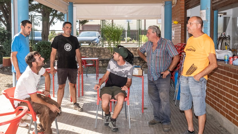 La vida intentaba este lunes volver a su ritmo natural en Vera del Moncayo. En este municipio zaragozano todos coinciden en una cosa: el pueblo se ha salvado gracias a los jóvenes y los agricultores que se negaron a abandonarlo. Desde el sábado, varias cuadrillas se organizaron para colaborar y trabajar junto a los bomberos. En total, unos 50 vecinos resistieron en el localidad, amenazada por un voraz incendio, junto a los efectivos desplegados. Javier Lahuerta (41 años), Julio Lahuerta (54), Antonio Casas (58), Jesús Enbid (50) y David Gil (34 años) se reúnen en la barra del bar para tomar “la primera cerveza después del fuego”. Son hombres rudos, con las manos y el rostro curtidos por el trabajo del campo. “Las hemos visto de todos los colores aquí, pero con esto te daban ganas nada más que de llorar”, afirma Casas. “La gente me pregunta que cómo ha sido. No sé explicarlo. Solo se me ocurren tres palabras: cansancio, miedo e incertidumbre”, se sincera. “Se nos ha quemado hasta el Ferrari”, dice refiriéndose a la máquina desbrozadora, en un intento de levantar el ánimo.