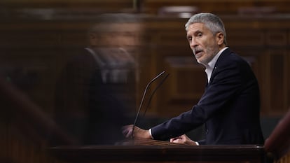 El ministro del Interior, Fernando Grande-Marlaska, ha comparecido este miércoles en el pleno del Congreso para informar sobre la tragedia ocurrida el pasado 24 de junio en la frontera entre Nador y Melilla. Aunque es la primera vez que el ministro da explicaciones de forma oficial, más allá de declaraciones puntuales a los medios, no ha revelado nada nuevo sobre lo acontecido. El ministro ha vuelto a defender la actuación policial de los agentes españoles con el uso “oportuno y proporcionado” de material antidisturbios y ha evitado cualquier reproche a los socios marroquíes. Hasta 10 veces ha insistido Grande-Marlaska en su primera intervención en la violencia ejercida por el grupo de cerca de 1.700 migrantes y refugiados, provenientes en su mayoría de Sudán, que protagonizó un intento “intolerable y violento” de cruzar la frontera. “No hubo una masacre” en Melilla”, ha asegurado.