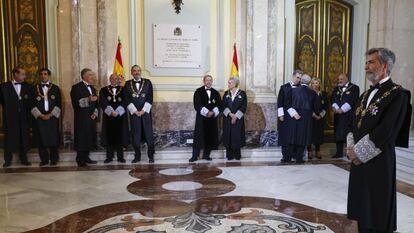Para hacerlo oficial en el alto tribunal, Lesmes ha convocado una reunión de la Sala de Gobierno, que ha emitido un duro comunicado en el que reclama “que se ponga fin de inmediato a este desastre institucional” cuyas consecuencias, asegura, “no solo están llevando en particular al Tribunal Supremo a una situación límite, sino que están suponiendo, además la deslegitimación del propio Consejo General del Poder Judicial, perjudican la imagen del Poder Judicial y afectan gravemente a la misma Constitución”. La cúpula del tribunal ya se pronunció el 26 de septiembre sobre la situación creada por el bloqueo en la renovación del CGPJ. En aquella ocasión, reclamó un acuerdo entre las fuerzas políticas para evitar la dimisión de Lesmes. Una vez consumada esta, ha elevado el tono y reprocha al Congreso y al Senado el “incumplimiento ya casi por cuatro años (...) de su obligación” de elegir a los vocales del nuevo CGPJ.