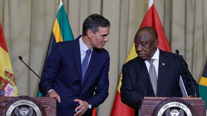 El segundo gran viaje africano de Pedro Sánchez, después del que llevó a cabo por Angola y Senegal en 2021, ha supuesto un espaldarazo a la entrada de España en una zona estratégica en la que aún tiene poca presencia, según el análisis del Gobierno y de algunos empresarios que acompañan al presidente en el viaje. Sánchez ha anunciado en una rueda de prensa conjunta con el presidente de Sudáfrica, Cyril Ramaphosa, que España pondrá encima de la mesa hasta 2.115 millones de euros en los próximos cinco años para apoyar que empresas españolas participen en proyectos de energía renovable y clima en el país más meridional de África.