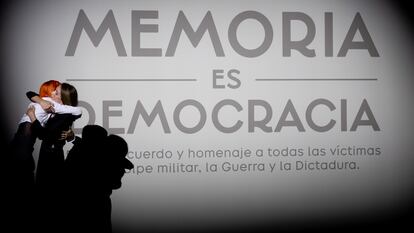 Luis Pérez Lara, de 86 años, presidente de la asociación de expresos y represaliados políticos del franquismo, comentaba al abandonar el auditorio: “Hoy es uno de los días más felices de mi vida. Llevo 83 años esperando que ocurriera una cosa así, desde que con tres años empezaron a insultarme por ser hijo de un republicano. Ver al Gobierno casi en pleno en este acto de reconocimiento ha sido muy emocionante”. También lo celebraba el historiador Nicolás Sánchez-Albornoz, de 96 años, que logró fugarse del campo donde trabajaban los presos que construían el Valle de los Caídos, ahora llamado de Cuelgamuros. Benita Navacerrada, de 90 años, lloraba, muy emocionada y sin soltar una foto de su padre, cuyos restos sigue buscando: “Ya era hora de que pasara esto”. En el escenario, al recoger un documento de reconocimiento, la anciana se ha abrazado a Sánchez y a Bolaños, a los que ha dado las gracias por la reciente exhumación de una fosa común en el cementerio de Colmenar Viejo (Madrid). “El ministro me ha dicho que van a seguir buscándole. Estoy muy contenta”.