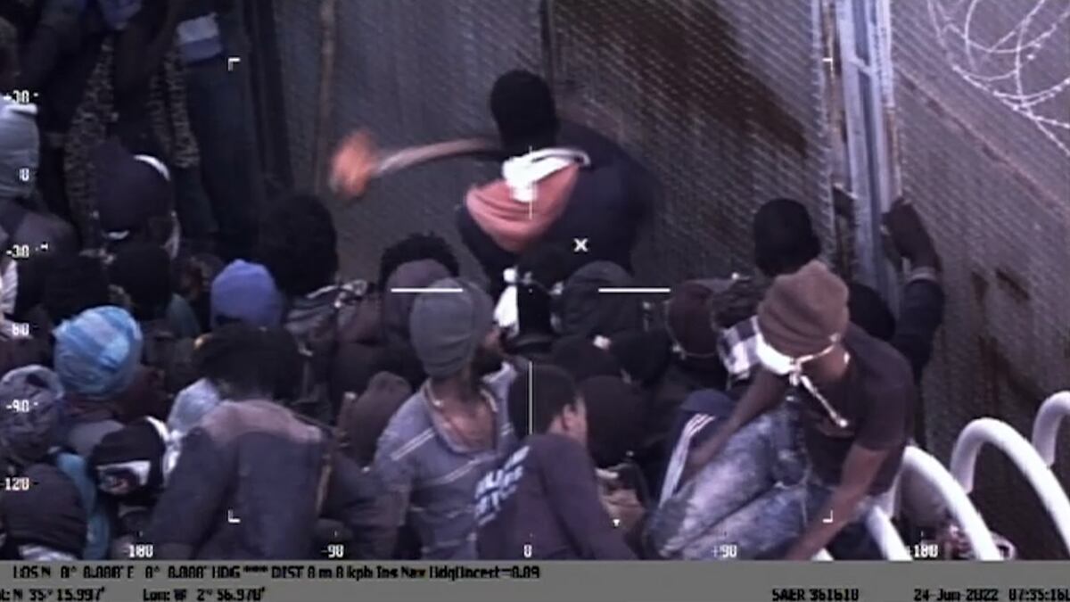 El helicóptero sí graba ese momento, capta la estampida y los instantes posteriores en los que se ve a decenas de personas atrapadas. Se distingue a las víctimas amontonadas, gritando y sacando los brazos pidiendo ayuda. Pero, en ese momento, la aeronave se mueve y pasa a centrarse en grabar la entrada de los supervivientes en Melilla y todo el operativo de contención del grupo por parte de la Guardia Civil.