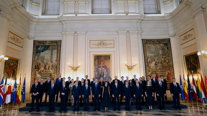 La única fotografía que le acompañaba en la sala de audiencias del Palacio de la Zarzuela donde se grabó el discurso era la de la cena de gala de los jefes de Estado y Gobierno que participaron en junio en la cumbre de la OTAN celebrada en Madrid.