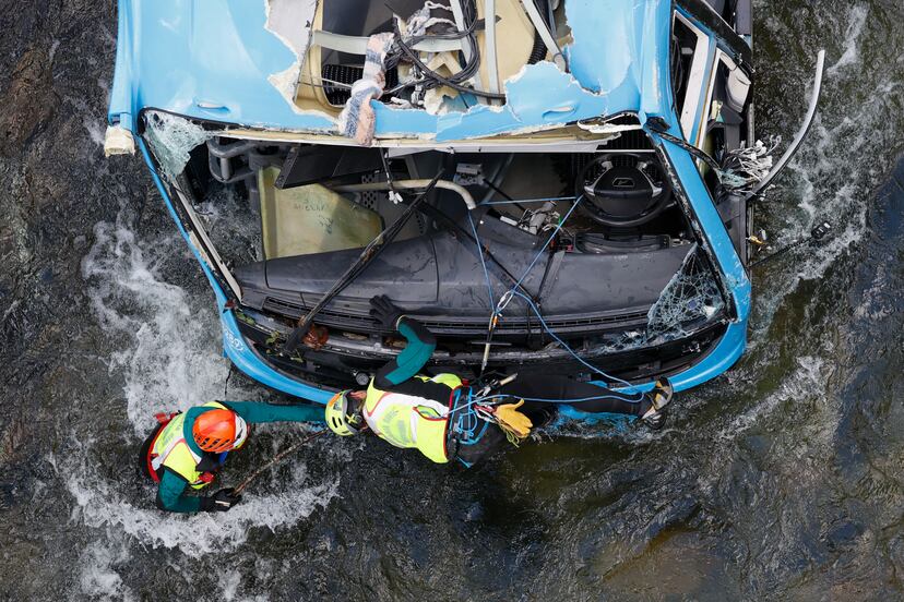 Mientras las familias velan ya los cuerpos, la investigación de las causas del accidente, a cargo de la Policía Judicial de la Guardia Civil, empieza a recoger las piezas del puzle. El fuerte temporal y un posible exceso de velocidad son elementos que se analizarán a partir de lo que revele el tacómetro y el propio autocar, que será izado con grúas a partir de este martes, una vez descienda el caudal del río con la mejora del tiempo. Para llevar a cabo este operativo se están realizando cálculos y pruebas de carga. “Vamos a traer al grupo especial de siniestros de tráfico para investigar”, ha dicho José Miñones, delegado del Gobierno en Galicia, desplazado al lugar de la tragedia. Es necesario comprobar la resistencia del puente y el peso del vehículo, ahora multiplicado por cuatro porque está lleno de agua.