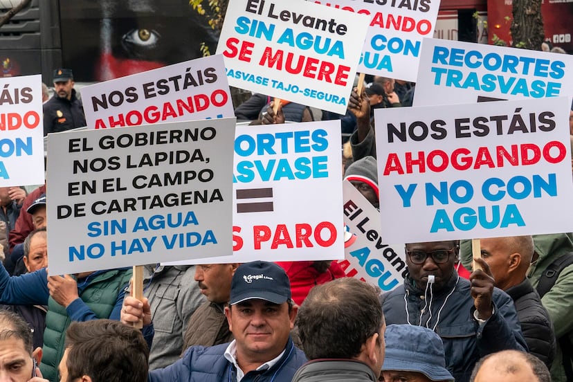 El sureste peninsular se ha manifestado unido este miércoles frente al recorte del trasvase Tajo-Segura. Miles de personas —15.000, según la organización, y 7.000, según la Delegación del Gobierno— convocados por la Federación de regantes del Segura (Scrats) se han concentrado delante del ministerio de Transición Ecológica para pedir que no se recorte el agua que riega la agricultura de las provincias de Alicante, Murcia y Almería. Pero, sobre todo, se ha producido una foto poco frecuente: la unidad de prácticamente todo el espectro político. Tanto el PP como el PSOE han mandado delegaciones a la concentración, así como los gobiernos de la Región de Murcia, de la Generalitat valenciana y de la Junta de Andalucía. El presidente murciano, Fernando López Miras, ha encabezado la representación de su comunidad autónoma, mientras que el Ejecutivo valenciano ha estado representado por la consejera de Agricultura, Isaura Navarro, y el andaluz por su homóloga en Andalucía, Carmen Crespo. En las últimas semanas se ha vuelto a intensificar el conflicto respecto al plan del Tajo que quiere aprobar el Ejecutivo central y que supone una reducción del trasvase, un asunto que enfrenta a las comunidades de Murcia, Andalucía y Comunidad Valenciana con Castilla-La Mancha (las dos últimas gobernadas por los socialistas). El Consejo de Estado emitirá el próximo 19 de enero su dictamen sobre el real decreto que revisa la planificación de 12 demarcaciones, incluyendo la modificación de los caudales ecológicos del Tajo-Segura, informa Europa Press.