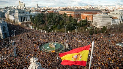 Decenas de miles de personas se han concentrado este sábado en la Plaza de Cibeles y alrededores, en el centro de Madrid, contra el Ejecutivo de Pedro Sánchez. Eran 31.000, según la Delegación del Gobierno, y medio millón según los convocantes, cifra que parece poco ajustada a la realidad porque la concentración no impedía, durante la lectura del manifiesto, moverse entre la multitud y rodear la plaza. A la protesta, convocada por un centenar de asociaciones y colectivos bajo el lema ‘Por España, la democracia y la Constitución’, han asistido dirigentes y miembros de Vox, como Santiago Abascal (único líder nacional presente en la concentración); del PP, (Miguel Tellado vicesecretario de organización; Pedro Rollán, vicesecretario de Coordinación Autonómica y Local; Dolors Montserrat, portavoz en el Parlamento Europeo; o la diputada Cayetana Álvarez de Toledo), y de Ciudadanos (Inés Arrimadas, exlíder del partido, y Begoña Villacís, vicealcaldesa de Madrid). También han participado la exdirigente de UPyD Rosa Díez, el expolítico del PP Aleix Vidal-Quadras, el filósofo Fernando Savater y el escritor Andrés Trapiello, entre otros. Júlia Calvet, presidenta del colectivo S´ha acabat, y Nacho Trillo, presidente de la asociación Resiste España, han leído —interrumpidos en varias ocasiones por gritos de “¡Sánchez dimisión!”, “¡Sánchez a prisión!” y “¡Sánchez dictador!”— un manifiesto que aseguraba que la democracia está en peligro.