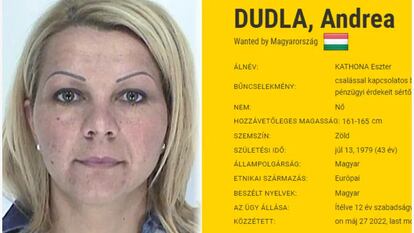 Andrea Dudla, condenada e investigada en Hungría por delitos de falsedad documental, blanqueo de capitales, estafa y fraude, era una prófuga de la justicia desde hacía más de 10 años y formaba parte de la lista de los fugitivos más buscados de Europa. Su largo historial ha concluido con su arresto en el aeropuerto madrileño de Barajas, ha informado este jueves la Policía Nacional en un comunicado. La investigación conjunta entre España y República Dominicana permitió localizarla en enero en este último país, desde donde ha sido deportada.