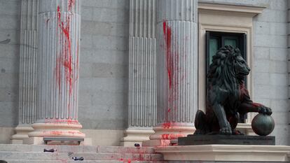 Una decena de miembros de organizaciones contra el cambio climático se han subido este jueves a una de las esculturas de leones del Congreso de los Diputados y han rociado con pintura roja tanto la estatua como varios peldaños de las escaleras, dos columnas y parte de la pared. Nueve de los participantes en la protesta han sido arrestados, según fuentes policiales.