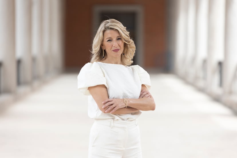 Yolanda Díaz (Fene, A Coruña, 51 años), vicepresidenta segunda del Gobierno de coalición y ministra de Trabajo, se presentó el domingo como futura candidata a la presidencia por parte de Sumar vestida de blanco. Blanco roto —de la diseñadora gallega Purificación García—, símbolo de un proyecto que nace y con el que persigue asumir el desafío de reducir la desigualdad en España, “el principal reto de este país”, en sus palabras. No la acompañó nadie del equipo de dirección de Podemos a pesar de que fue su ex secretario general, Pablo Iglesias, quien la designó sucesora al frente de la coalición de Unidas Podemos hace dos años. Díaz asegura que la plataforma sigue “abierta” a todos. La entrevista se celebró en dos momentos: el viernes, en su despacho, lleno de libros, con un tocadiscos en el que cuando descansa suenan vinilos de Toquinho, Miles Davis o un concierto de Mozart; y el domingo, tras el acto celebrado en Madrid, en el que cientos de ciudadanos hicieron una larguísima cola para entrar —3.000 lo lograron y otros 2.000 lo vieron en un patio con pantallas—. Más de una docena de partidos de izquierdas arroparon a la nueva candidata.